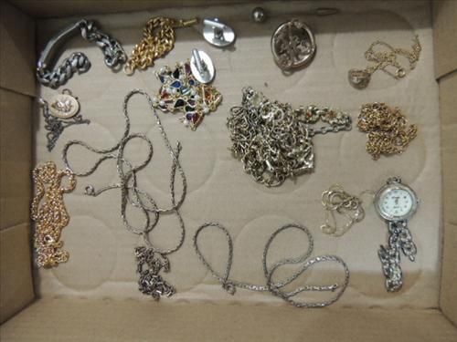 LOT 15 VINTAGE GOLD & SILVER TONE LADY'S JEWELRY: BRACELETS, NECKLACES, PINS.  AS SHOWN.  VIEW PICTURE FOR DETAIL.