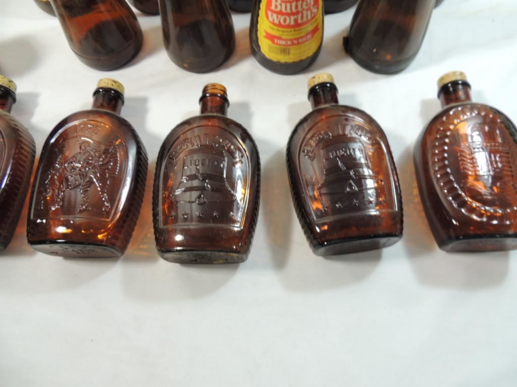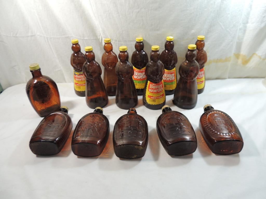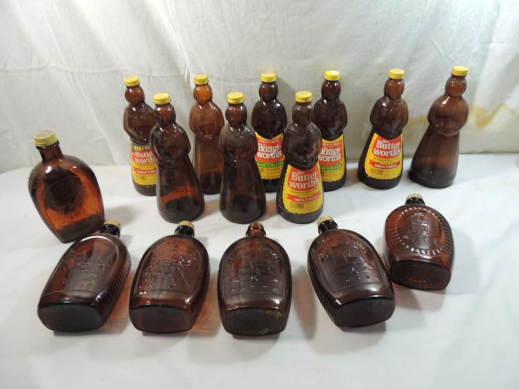 VINTAGE SYRUP BOTTLES, BROWN BOTTLES, COLLECTIBLE MRS BUTTERWORTHS AND LOG CABIN BOTTLES AS SHOWN SEE PHOTO FOR MORE DETAILS.