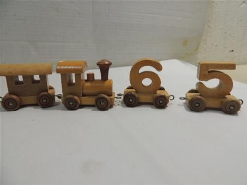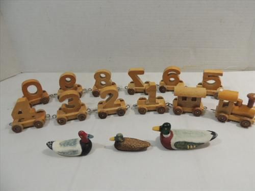 LOT 15 VINTAGE WOOD TOYS: 12 WOOD TRAIN CARS WITH NUMBERS, 3 SMALL CARVED DUCKS SIGNED. AS SHOWN. VIEW PICTURE FOR DETAIL.