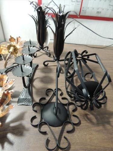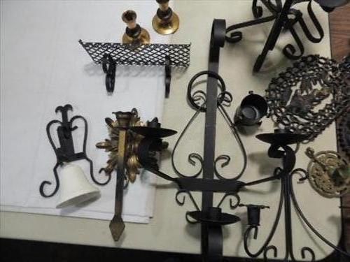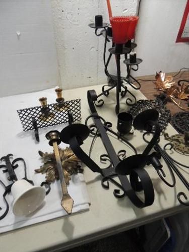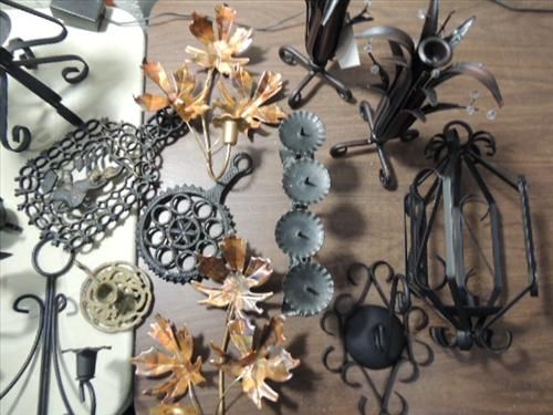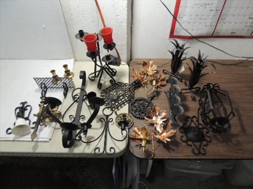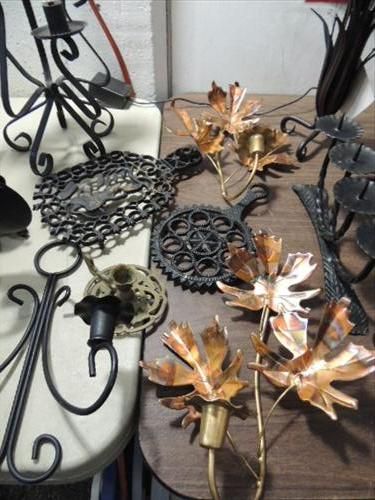 LOT 15 VINTAGE WROUGHT IRON CANDLE HOLDERS, TRIVETS AND MORE. AS SHOWN. VIEW PICTURE FOR DETAIL.