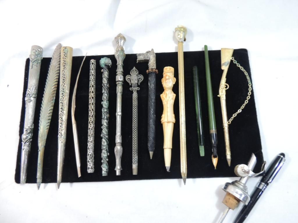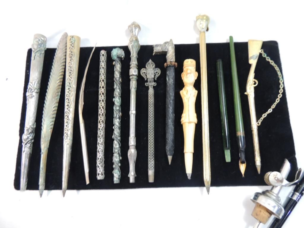 ANTIQUE VINTAGE PENS, FEATHER METAL SILVERTONE DECORATIVE ROSES, ANIMAL AS SHOWN SEE PHOTO FOR MORE DETAILS.