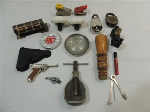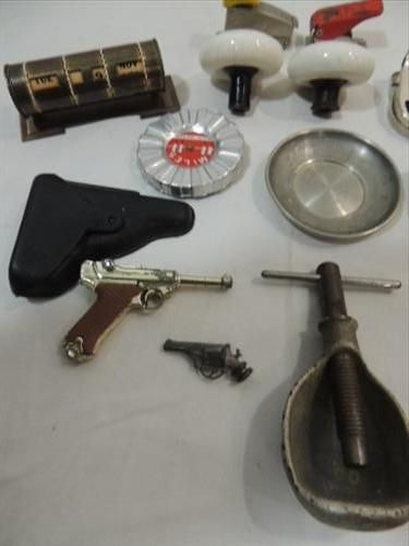LOT 16 ASSORTED COLLECTIBLES: MARX DIE CAST LUGER CAP PISTOL, 2 ANTIQUE WHITE ENAMEL DOOR KNOBS, VINTAGE IRVING L COBB SMOKING PIPE, MCGILL MOUSE TRAP, DIE CAST METAL NUT CRAKER, VINTAGE ADVERTISING CIGARETTE LIGHTERS AND MUCH MORE. AS SHOWN. VIEW PICTURE FOR DETAIL.