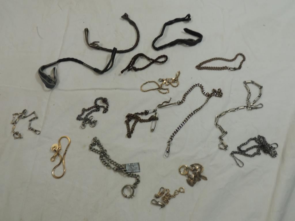 ASSORTED POCKET WATCH FOBS, LEATHER FOBS, CHAIN FOBS, COLLECTIBLE, CHAINS, GOLDTONE, SILVERTONE, AS SHOWN SEE PHOTO FOR MORE DETAILS.