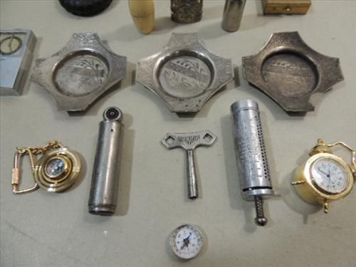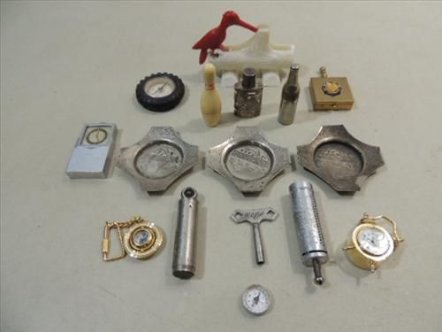 LOT 16 VINTAGE ITEMS: BOWLING PIN LIGHTER, METAL BEAR BOTTLE LIGHTER, 3 SMALL ASH TRAYS, 3 COMPASSES, ANTIQUE BALLOON TIRE AIR GAUGE, AND MORE.  AS SHOWN.  VIEW PICTURE FOR DETAIL.