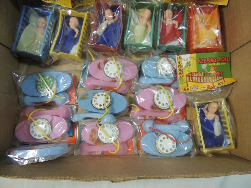 VINTAGE SLEEPING DOLLS PLASTIC WITH COVER ON BED. NEW SEALED NEVER OPENED. VINTAGE PHONE TOYS PLASTIC TREAT BAG AS SHOWN SEE PHOTO FOR MORE DETAILS.