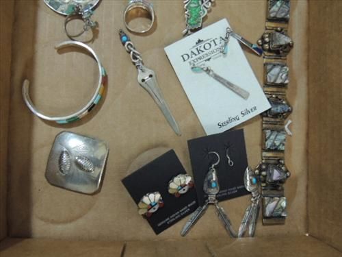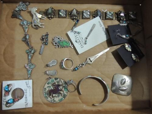LOT 16 VINTAGE STERLING SILVER & ABOLNE, TURQOISE JEWELRY: BRACELETS, EWARRINGS, PINS. AS SHOWN. VIEW PICTURE FOR DETAIL.