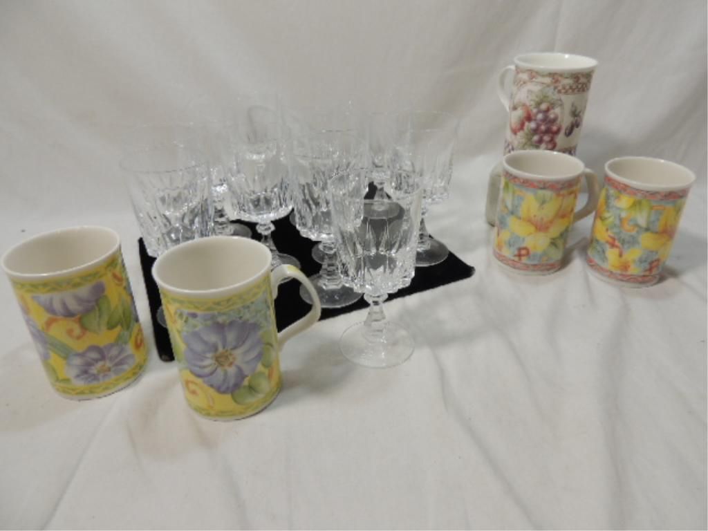 (4) MUGS EXPRESSIONS FINE CHINA FULL BLOOM DESIGNED BY BRENWEN KERRIGAN A ROYAL DOULTON PRODUCT. (11) GLASS SMALL WINE GLASSES. AS SHOWN SEE PHOTO FOR MORE DETAILS