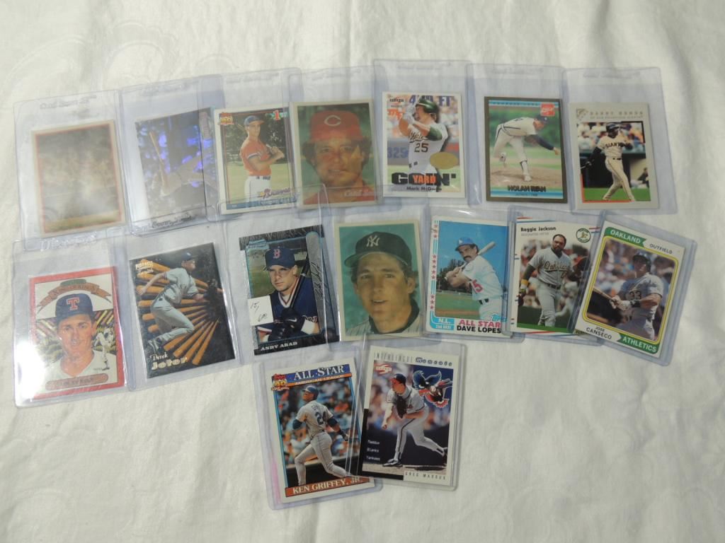 MIXED MAKERS AND YEARS REGGIE JACKSON, JOSE CANSECO, GREG MADDUX, KEN FRIFFEY JR. DAVE LOPES, GOOD CONDITION. IN SLEEVE. TRADING CARDS. COLLECTIBLE. AS SHOWN. SEE PHOTO FOR MORE DETAILS.