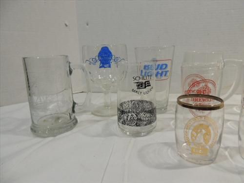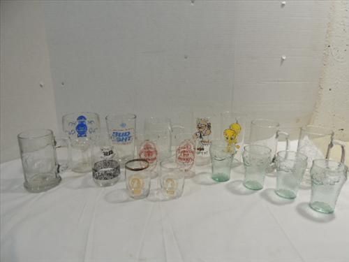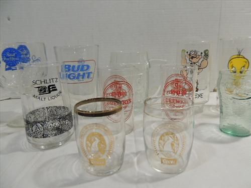 LOT 17 VARIOUS BEER & SODA GLASSES: COKE, PABST, DADS ROOTBEER, DREWRY, COLT MALT TWEETIE, POPEYE AND MORE. AS SHOWN. VIEW PICTURE FOR DETAIL.