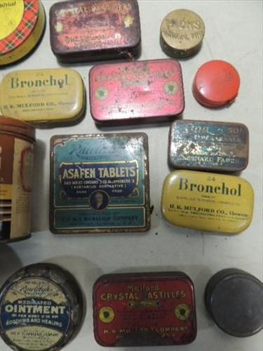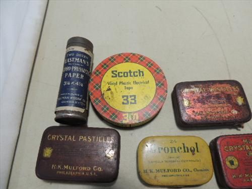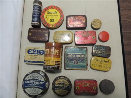 LOT 17 VINTAGE METAL TINS: SCOTCH TAPE, ROTA CAPS, ASAFEN TABLETS, BRONCHOL, RAWLEIGH'S AND MUCH MORE. AS SHOWN. VIEW PICTURE FOR DETAIL.