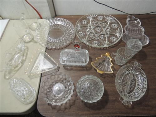 LOT 17 VINTAGE PRESSED GLASS: 2 AMERICANA FOSTORIA, 4 HOLIDAY CANDY DISHES, 1976 YOSEMITE SAM JUICE GLASS AND MUCH MORE. AS SHOWN. VIEW PICTURE FOR DETAIL.