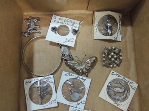 LOT 17 VINTAGE STERLING SILVER JEWELRY: PINS, EARRINGS AND BRACELETS. NICE OLD QUALITY JEWELRY. AS SHOWN. VIEW PICTURE FOR DETAIL.