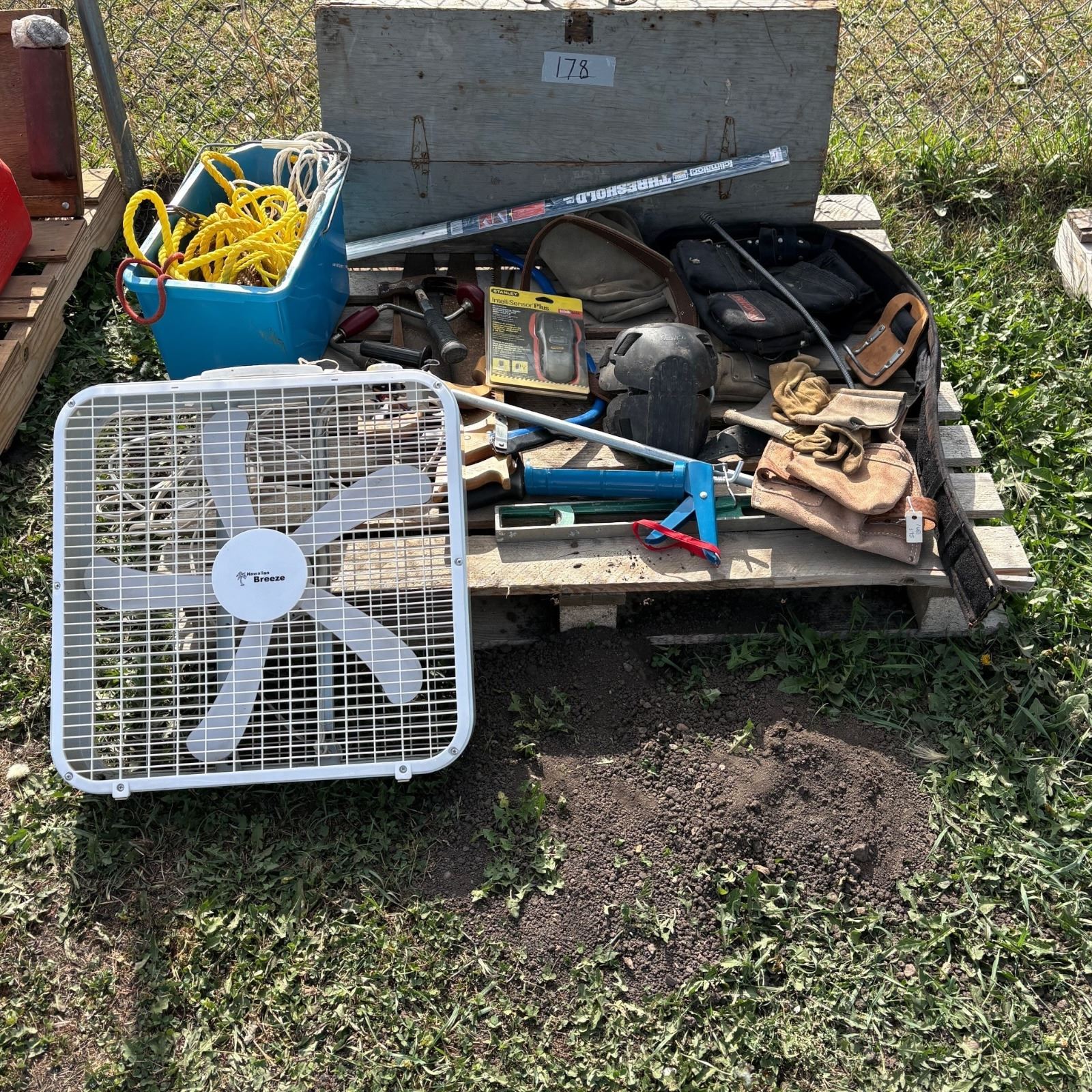 fan, bucket of rope, tool belt, knee pads, hand saws, buck saw, carpenters tools, tool box, stud finder