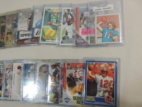LOT 18 ASSORTED 1970S TO 2000'S STARS & ROOKIE FOOTBALL CARDS. ROGERS, PETERSON, ELWAY, AND MORE. AS SHOWN. VIEW PICTURE FOR DETAIL.