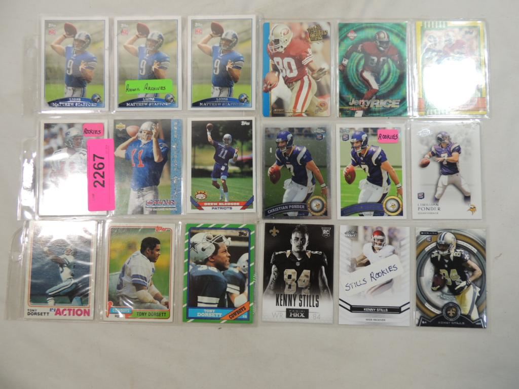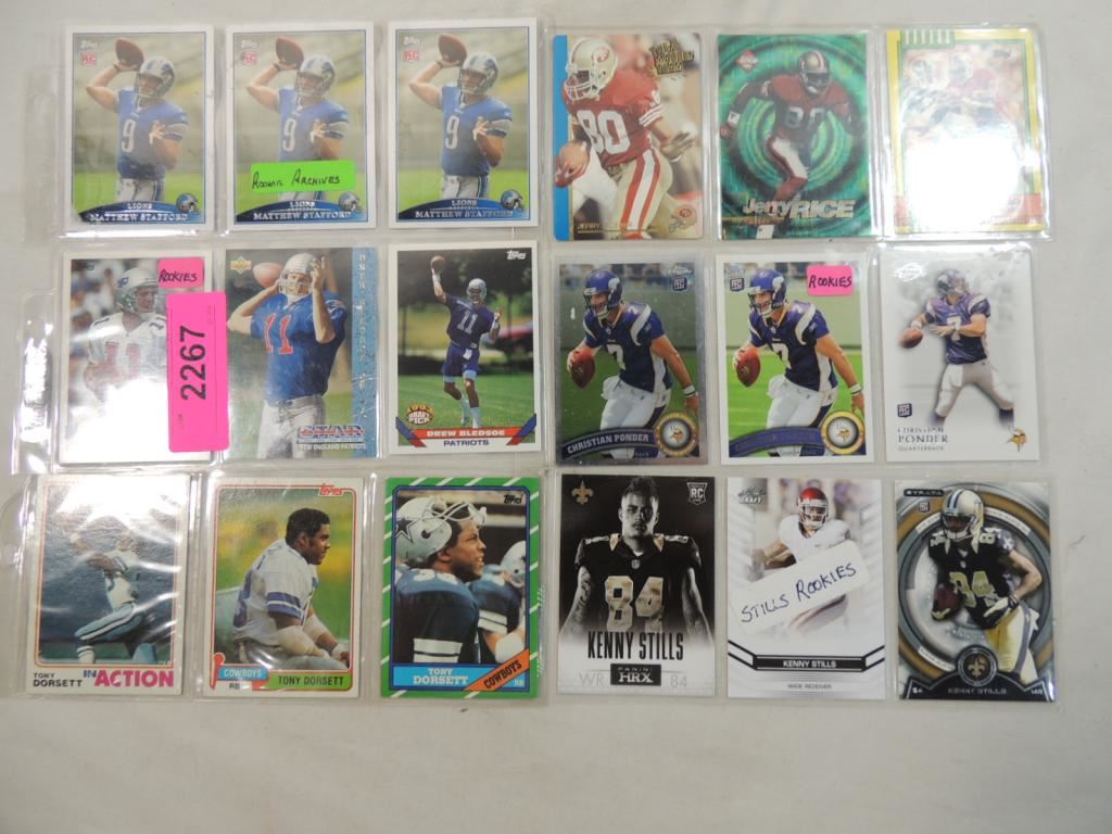 JERRY RICE, KENNY STILLS ROOKIES, MATTHEW STAFFORD ROOKIE ARCHIVES, CHRISTIAN PONDER ROOKIES, DREW BLEDSOE FOOTBALL PLAYER CARDS. TRADING CARDS. COLLECTIBLE. FOOTBALL MEMORABILIA. GOOD CONDITION AS SHOWN. SEE PHOTO FOR MORE DETAILS.