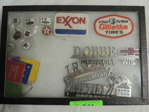 LOT 18 PETROLIANA: LAPEL PINS, DEALERSHIP TAGS, PATCHES, AND MORE. IN DISPLAY CASE. AS SHOWN. VIEW PICTURE FOR DETAIL.