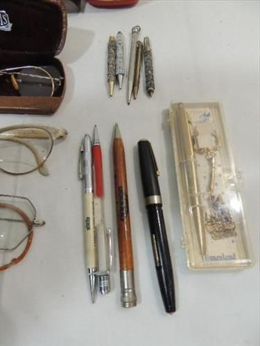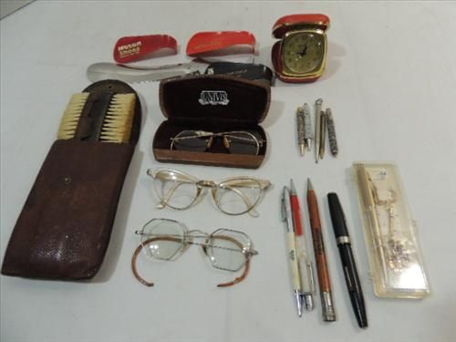 LOT 18 VINTAGE COLLECTIBLES: 3 EYE GLASSES, 9 PEN & MECHANICAL PENCILS, OLD CLOTHES BROSH, SHOE HORNS AND MORE. AS SHOWN. VIEW PICTURE FOR DETAIL.
