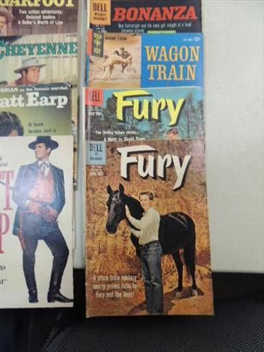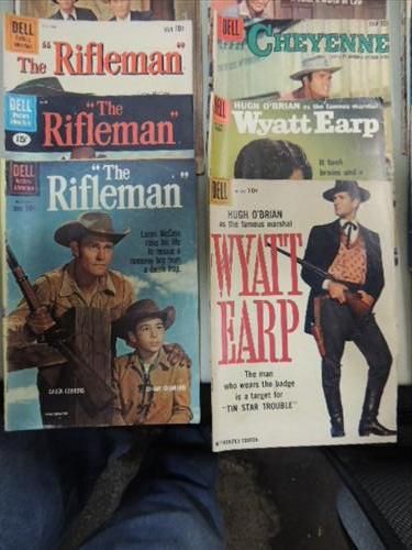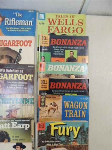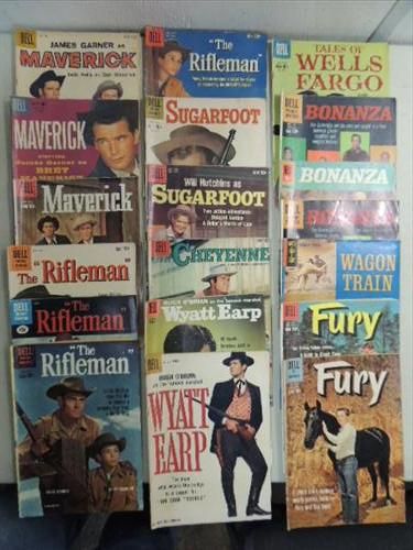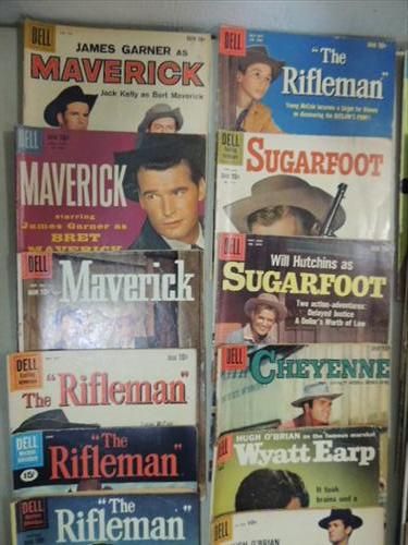 LOT 19 1957-59 DELL SILVER AGE COMICS: ALL WESTERN TV SHOWS WITH PHOTO COVERS. MAVERICK, RIFLEMAN,SUGARFOOT, CHEYENNE, WYATT EARP, BONANZA, FURY AND MORE. AS SHOWN. VIEW PICTURE FOR DETAIL.