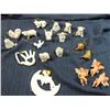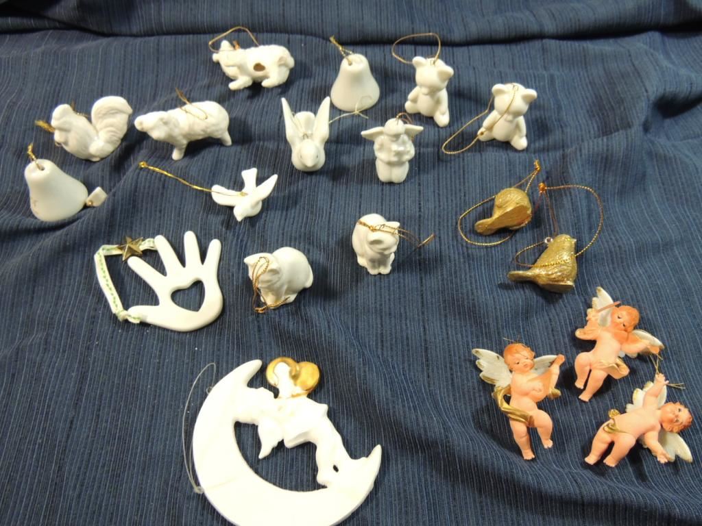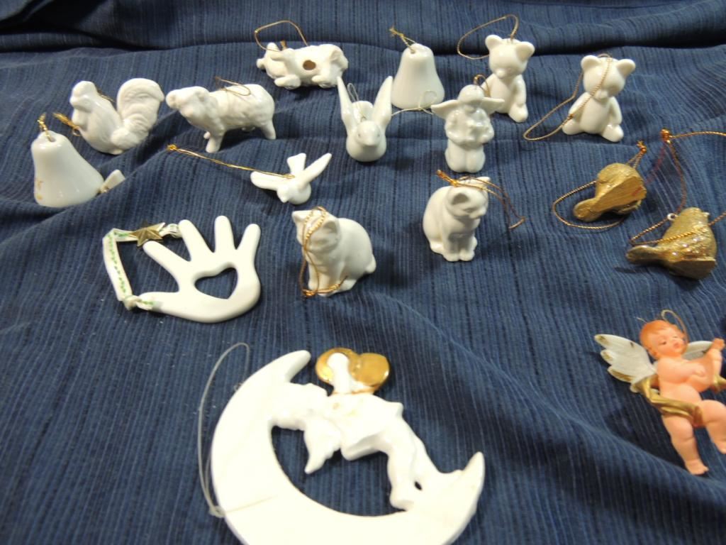 WHITE PORCELAIN ORNAMENTS, BELLS, CATS, ANGLES, DOVES, HANDS, LAMB, TEDDY BEAR, MOOM, CHERIBS, GOLD BIRDS, AS SHOWN SEE PHOTO FOR MORE DETAILS.