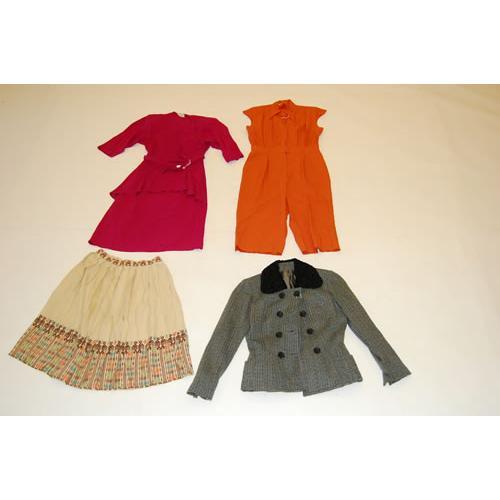 LOT 1940'S VINTAGE LADIES CLOTHING INCL. FUCHSIA SILK<BR>CREPE, ORANGE ROMPER, CREAM PLEATED SKIRT W/ ETHNIC<BR>BORDER, CREAM SILK DRESS W/ DOLMAN SLEEVES, BLUE SILK<BR>SHEATH, GREEN TWEED JACKET W/ LAMB COLLAR & MANS BLUE<BR>STRIPE BLAZER (7 PCS. TOTAL) - IMPERFECTIONS & LOSSES