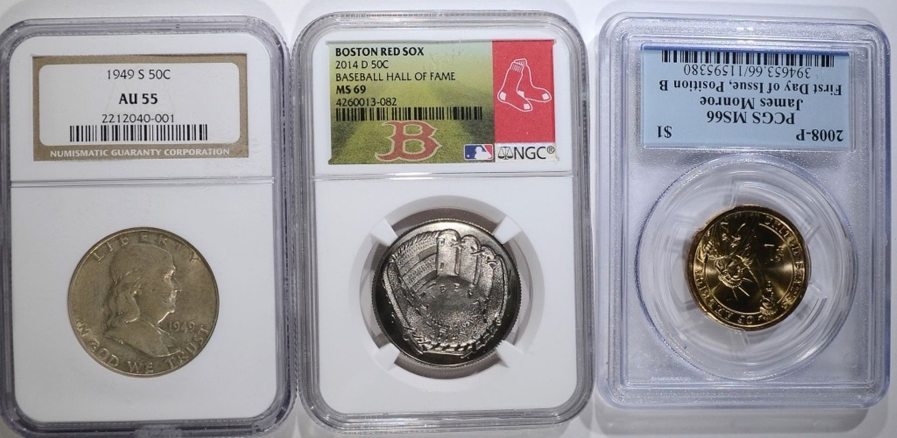 2008-P MONROE DOLLAR PCGS MS66 FIRST DAY OF ISSUE POSITION B & 2014 D BASEBALL HALL OF FAME NGC MS 69 BOSTON RED SOX CURVED COIN! ESTIMATE $125 - $150.