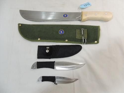 LOT 2 17"L STEEL MACHETTE AND CANVAS BELT SHEATH & CONTEMPORARY PAIR OF KNIVES IN CARRYING CASE. AS SHOWN. VIEW PICTURE FOR DETAIL.