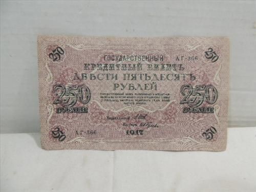 LOT 2 1917 RUSSIAN / SOVIET UNION 250 RUBLES WITH SWASTIKA / TWO HEADED EAGLE. AS SHOWN. VIEW PICTURE FOR DETAIL. PICTURE OF ORIGINAL WRAPPER WITH WAX SEAL IS INCLUDED IN THE IMAGES FOR THIS LOT. THIS IS FOR VERIFICATION. WRAPPER IS NOT INCLUDED IN LOT. AS SHOWN. VIEW PICTURE FOR DETAIL.