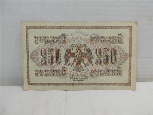 LOT 2 1917 RUSSIAN / SOVIET UNION 250 RUBLES WITH SWASTIKA / TWO HEADED EAGLE. AS SHOWN. VIEW PICTURE FOR DETAIL. PICTURE OF ORIGINAL WRAPPER WITH WAX SEAL IS INCLUDED IN THE IMAGES FOR THIS LOT. THIS IS FOR VERIFICATION. WRAPPER IS NOT INCLUDED IN LOT. AS SHOWN. VIEW PICTURE FOR DETAIL.
