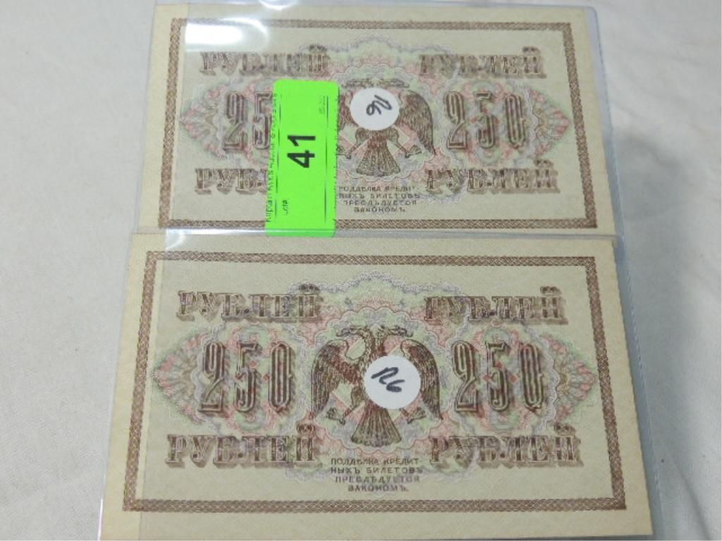 LOT 2 1917 RUSSIAN / SOVIET UNION 250 RUBLES WITH SWASTIKA / TWO HEADED EAGLE. AS SHOWN. VIEW PICTURE FOR DETAIL. PICTURE OF ORIGINAL WRAPPER WITH WAX SEAL IS INCLUDED IN THE IMAGES FOR THIS LOT. THIS IS FOR VERIFICATION. WRAPPER IS NOT INCLUDED IN LOT. AS SHOWN. VIEW PICTURE FOR DETAIL.