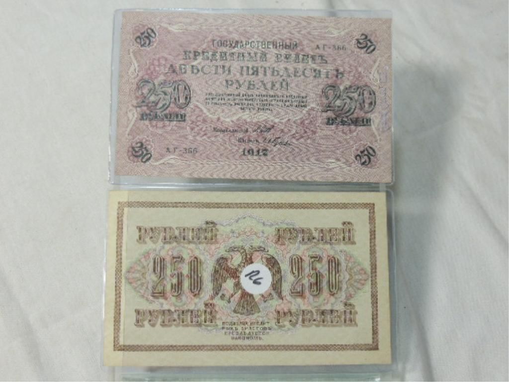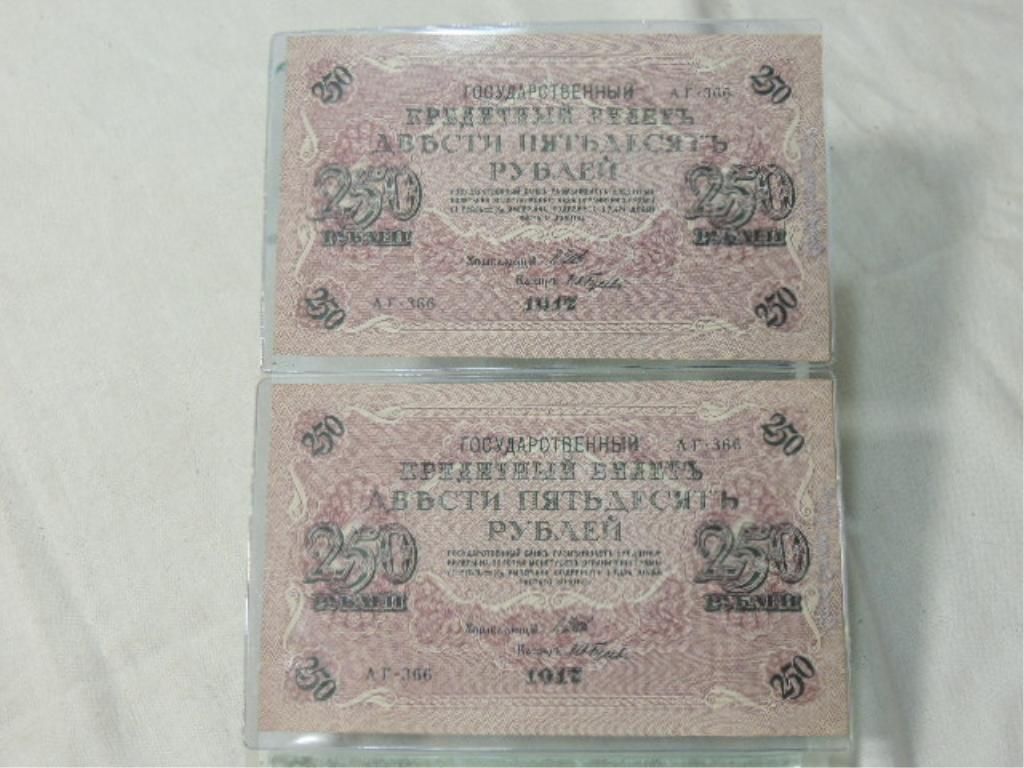 LOT 2 1917 RUSSIAN / SOVIET UNION 250 RUBLES WITH SWASTIKA / TWO HEADED EAGLE. AS SHOWN. VIEW PICTURE FOR DETAIL. PICTURE OF ORIGINAL WRAPPER WITH WAX SEAL IS INCLUDED IN THE