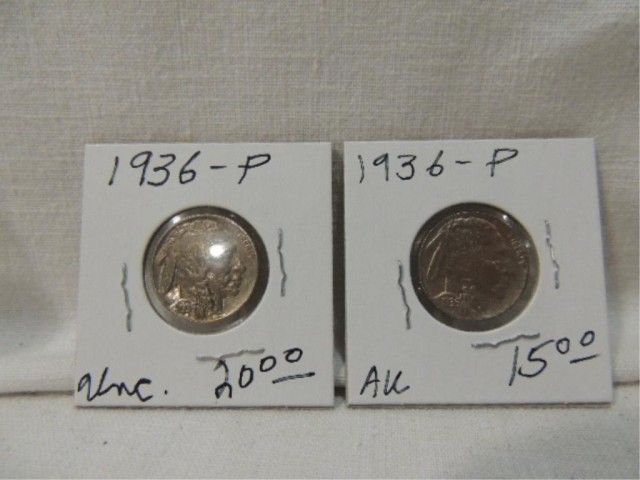 LOT 2 1936 (AU & UNC) FULL HORN BUFFALO NICKELS. AS SHOWN. VIEW PICTURE FOR DETAIL.