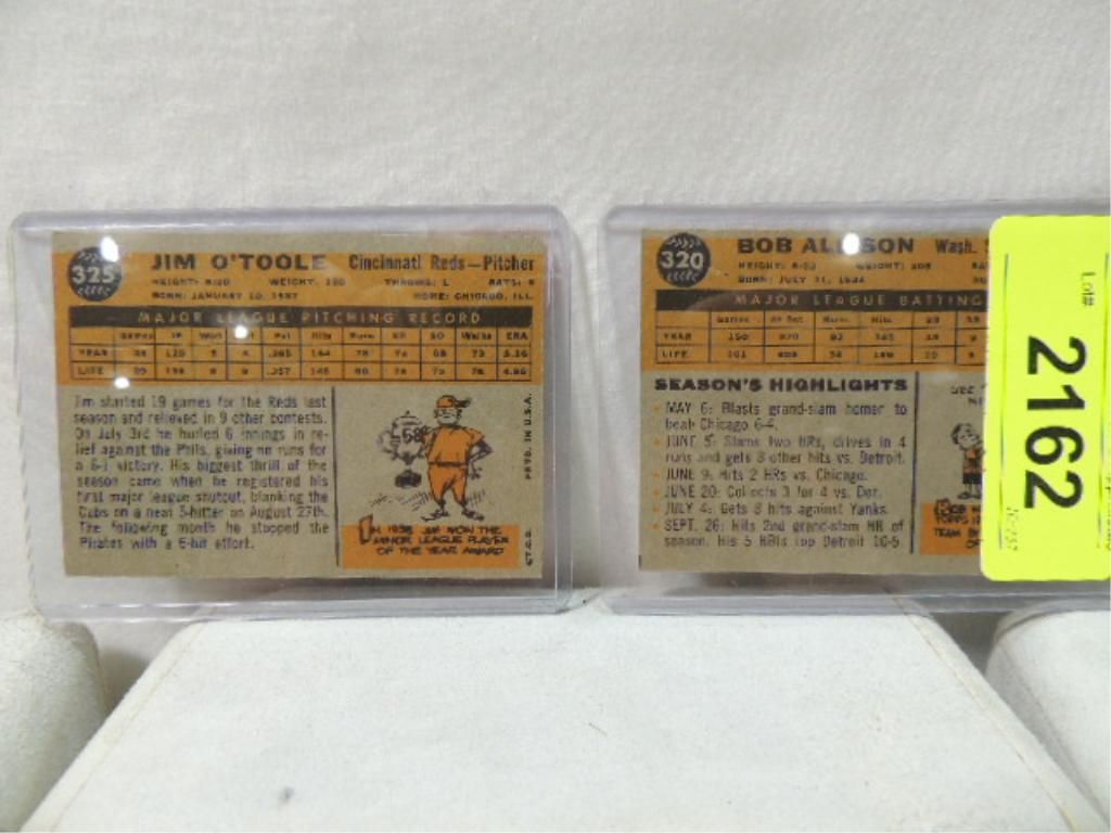 1960 TOPPS BASEBALL PLAYER CARDS. JIM OTOOLE TOPPS ALL STAR ROOKIE PITCHER CARD, BOB ALLISON TOPPS ALL STAR ROOKIE OUTFIELD. AS SHOWN SEE PHOTO FOR MORE DETAILS