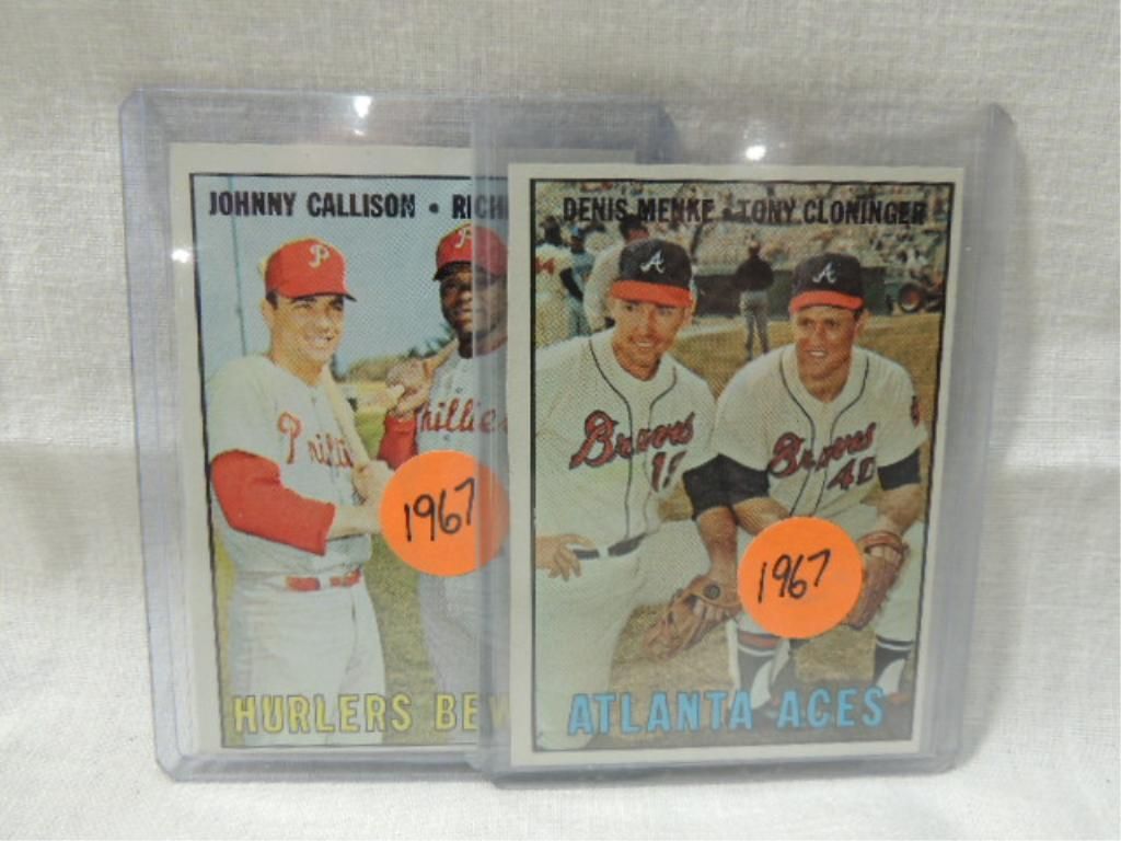 LOT 2 1967 TOPPS BASEBALL PLAYERS CARDS. DENIS MENKE TONY CLONINGER AND JOHNNY CALLISON RICHIE ALLEN. SEE PICUTRE FOR DETAILS.