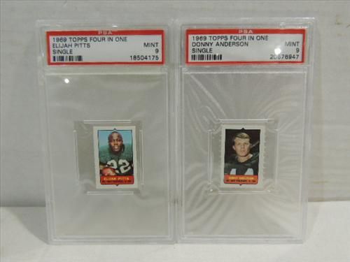 LOT 2 1969 TOPPS FOUR IN ONE GRADED FOOTBALL CARD: ELIJAH PITTS & DONNY ANDERSON. GRADED PSA MINT 9. AS SHOWN. VIEW PICTURE FOR DETAIL.