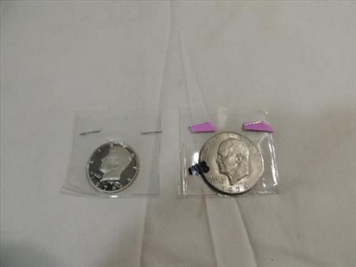 LOT 2 1979-S PROOF KENNEDY HALF, 1974-D IKE DOLLAR. AS SHOWN. VIEW PICTURE FOR DETAIL.