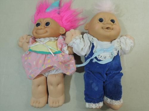 LOT 2 1990 RUSS 11" PLUSH BABY & GIRL TROLL DOLLS. AS SHOWN. VIEW PICTURE FOR DETAIL.
