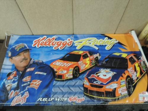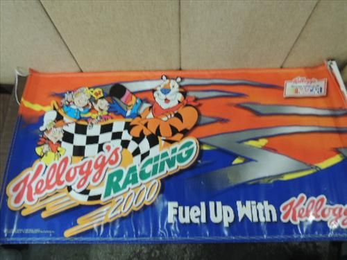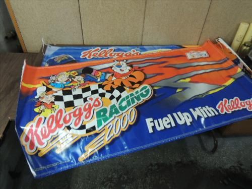 LOT 2 2000 & 02 NASCAR 72X36 KELLOGGS PROMO BANNER. BRASS RINGS FOR HANGING. AS SHOWN. VIEW PICTURE FOR DETAIL.