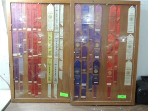 LOT 2 21X32 FRAMED VINTAGE WINNEBAGO COUNTY FAIR RIBBONS FOR COOKING, GARDENING AND MORE. AS SHOWN. VIEW PICTURE FOR DETAIL.