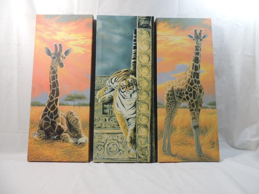 THREE PANEL WALL ART HANGING. SAFARI THEME. AS SHOWN. SEE PHOTO FOR MORE DETAILS.