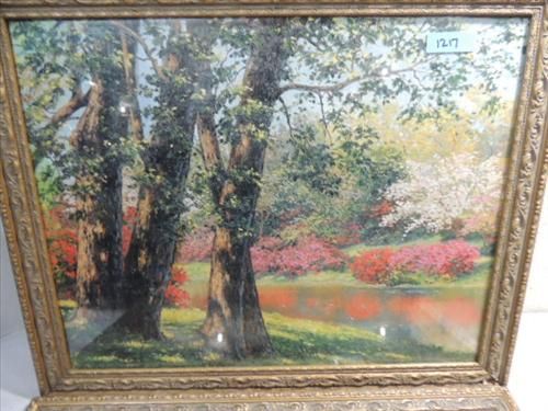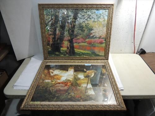 LOT 2 32X26 FRAMED PRINTS: SLEEPING BEAUTY & IMPRESSIONIST STREAM SCENE. AS SHOWN. VIEW PICTURE FOR DETAIL.