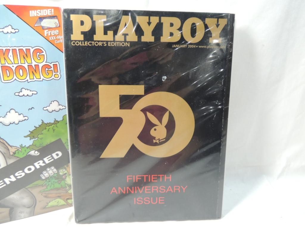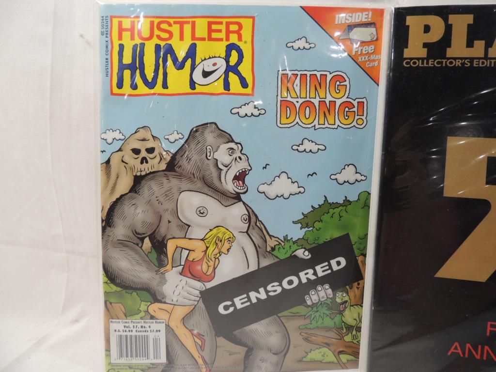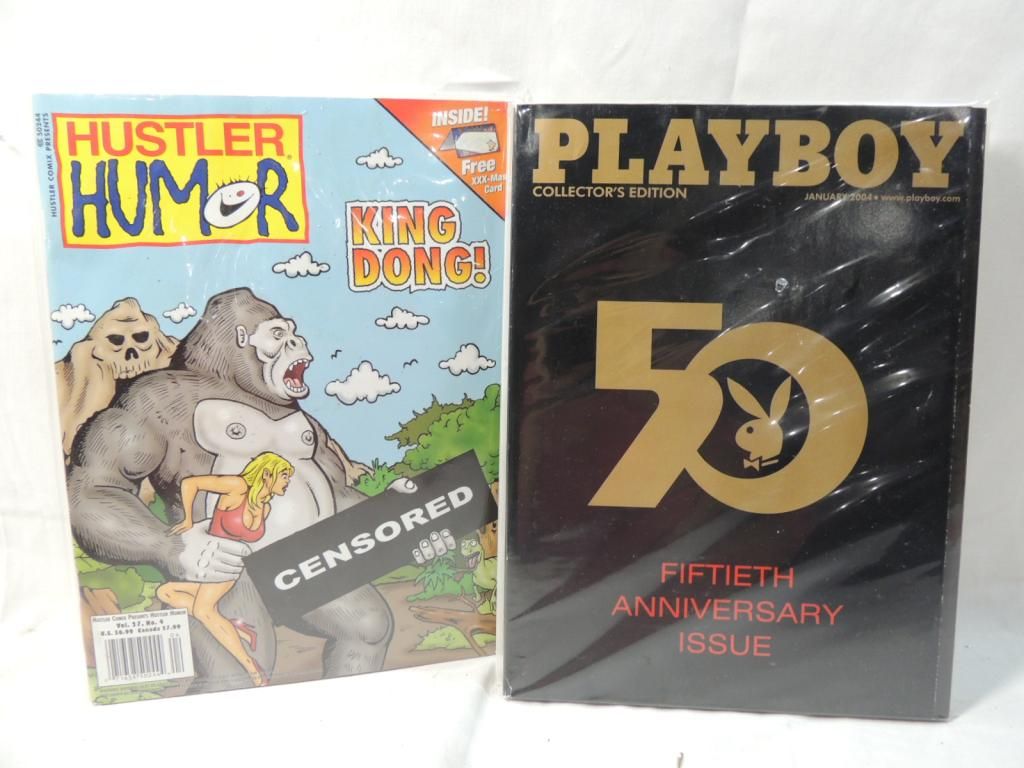 PLAYBOY 50TH ANNIVERSARY ISSUE AND HUSTLER HUMOR COMIC. AS SHOWN. SEE PHOTO FOR MORE DETAILS.
