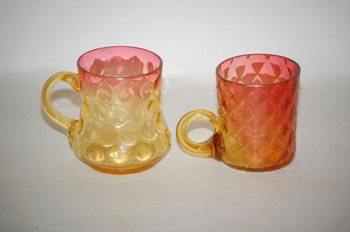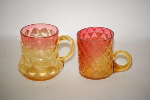 LOT (2) AMBERINA ART GLASS PUNCH CUPS - (1) 2 3/4" QUILTED DIAMOND PATTERN PUNCH CUP W/ APPLIED AMBER HANDLE & (1) 3 1/8" INVERTED THUMBPRINT PATTERN PUNCH CUP W/ APPLIED AMBER HANDLE-MINOR WEAR