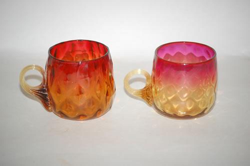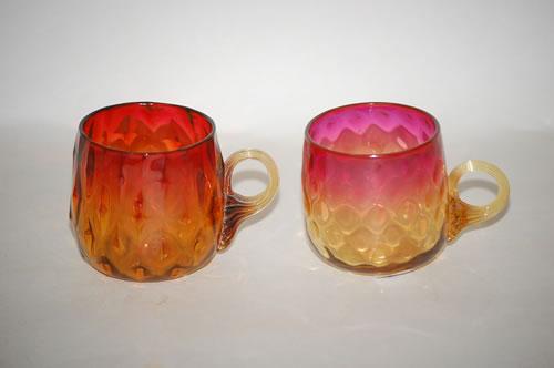 LOT (2) AMBERINA ART GLASS PUNCH CUPS - (1) 2 5/8" DIAMOND QUILTED PUNCH CUP W/ APPLIED RIBBED AMBER HANDLE (PROBABLY NEW ENGLAND GLASS) & (1) 2 5/8" THUMBPRINT PATTERN PUNCH CUP W/ APPLIED AMBER RIBBED HANDLE (PROBABLY LIBBEY) - MINOR WEAR
