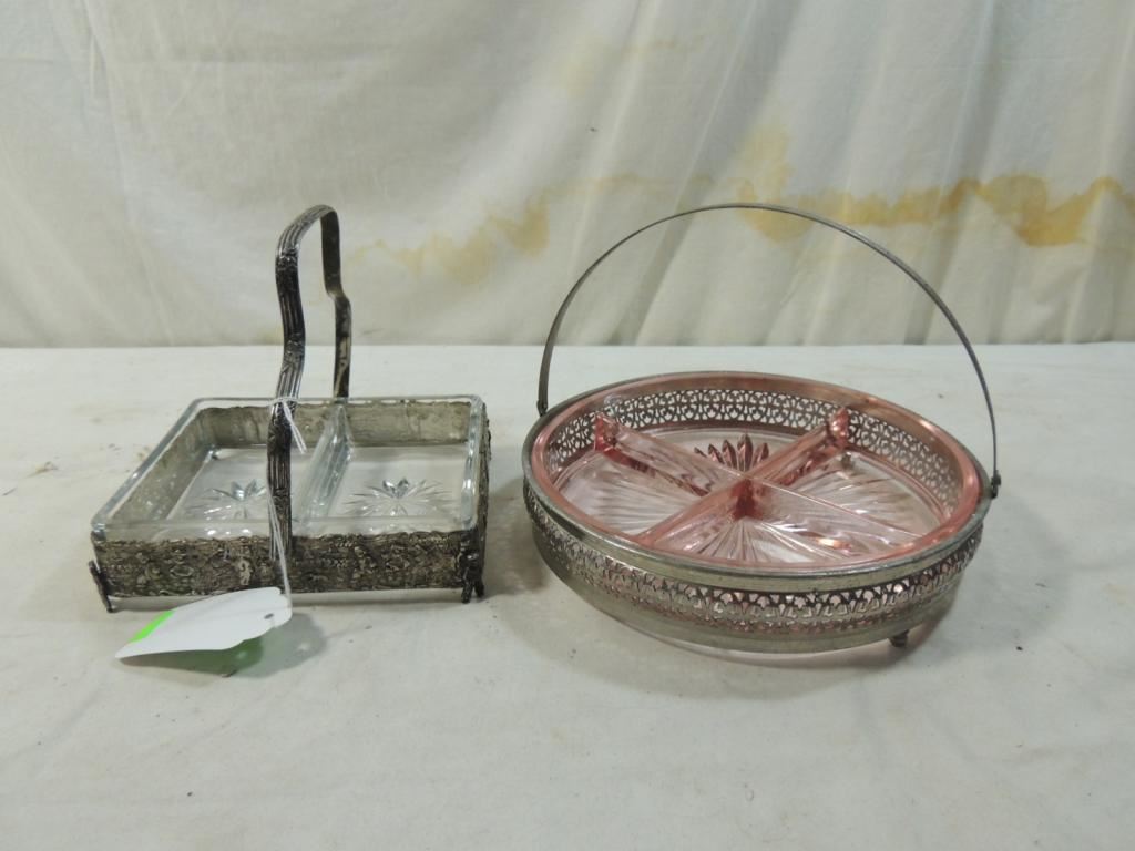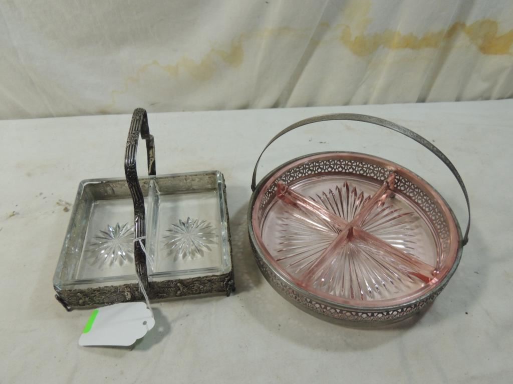PINK DEPRESSION GLASS SILVERPLATE? RELISH DISHES, DECORATIVE PLATES, DISHES, SERVING, PARTY, ELEGANT GLASS & METAL DISHES, AS SHOWN SEE PHOTO FOR MORE DETAILS.