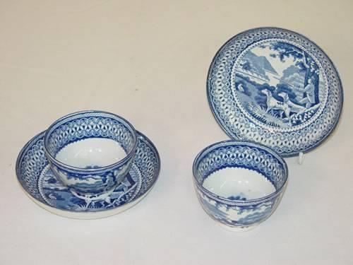 LOT (2) BLUE STAFFORDSHIRE HANDLESS CUPS & SAUCERS- HUNT DOG PATTERN - SMALL RIM CHIP TO (1) CUP;