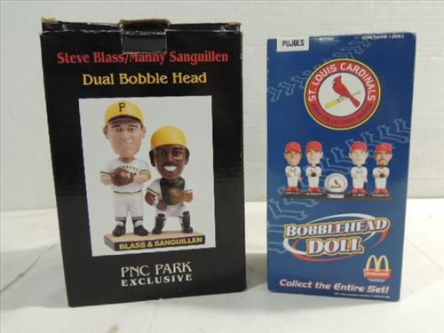 LOT 2 BOBBLE HEAD BASEBALL FIGURINES: PUJOLS & BLASS / SANGUILLEN. AS SHOWN. VIEW PICTURE FOR DETAIL.