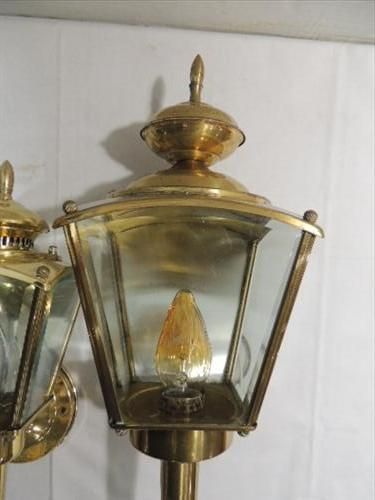 LOT 2 BRASS EXTERIOR WALL MOUNTING LIGHTS 17", 21". BEVELED GLASS. AS SHOWN. VIEW PICTURE FOR DETAIL.