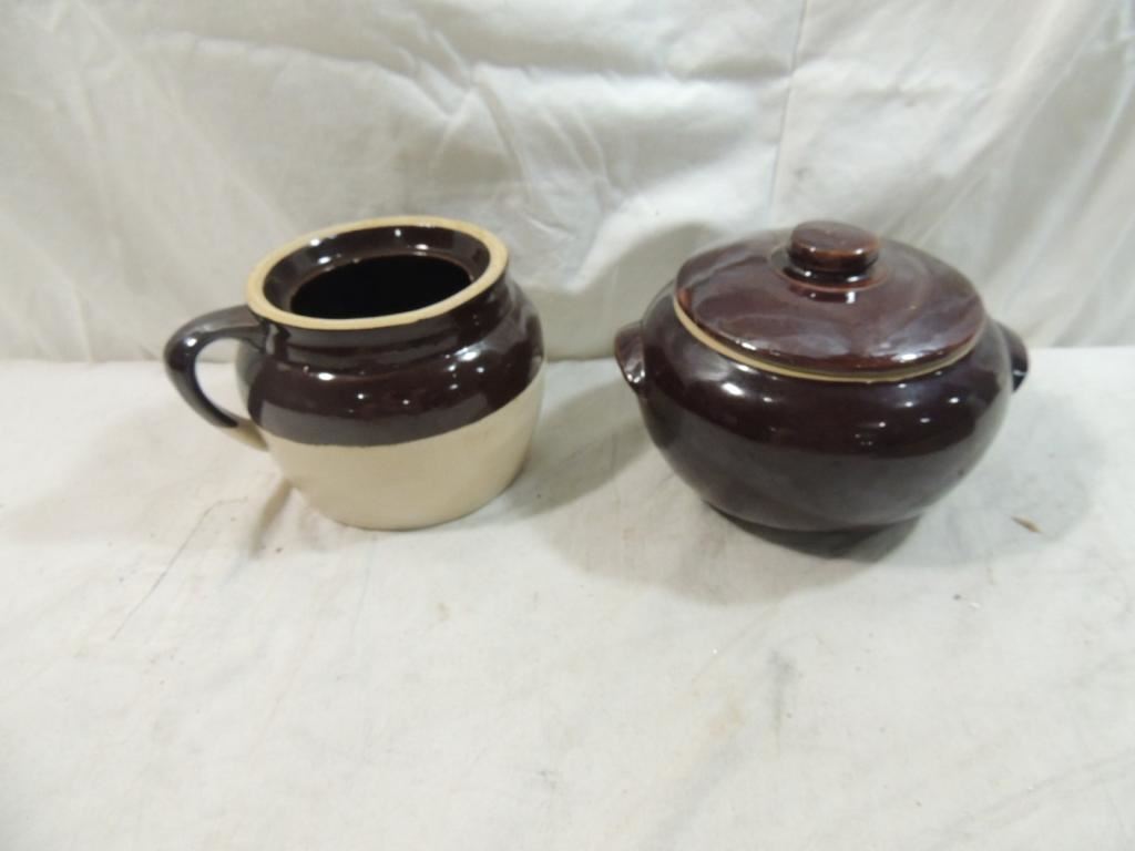 BROWN GLAZE POTTERY BOWL WITH LID, BEAN BOWL, POT WITH HANDLE, SERVING BOWL, AS SHOWN SEE PHOTO FOR MORE DETAILS.