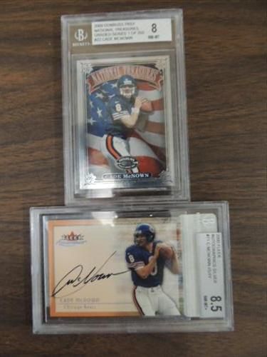 LOT 2 CADE MCNOWN GRADED & AUTOGRAPH 2000 FLEER AUTOGRAPH #71 COA & 2000 DONRUSS #22 FOOTBALL CARD. AS SHOWN. VIEW PICTURE FOR DETAIL. PLEASE BE ADVISED, AND INFORMED REGARDING SIGNATURES OR AUTOGRAPHS THAT WE SELL AT AUCTION: WE ARE NOT AUTHENTICATORS, AND WE DO NOT AUTHENTICATE, OR VALIDATE ANY AUTOGRAPHS OR SIGNATURES THAT WE OFFER AT AUCTION. SOME AUTOGRAPHS OR SIGNATURES MAY COME WITH AN AUTHENTICATION FROM ANY ONE OF LITERALLY HUNDREDS OF AUTHENTICATORS ACROSS THE COUNTRY, AND AROUND THE WORLD. WE DO NOT ENDORSE ANY AUTHENTICATOR, NOR DO WE GUARANTEE THAT ANY AUTOGRAPH OR SIGNATURE IS AUTHENTIC, OR THAT IT WILL PASS AUTHENTICATION BY ANY AUTHENTICATOR. ALL AUTOGRAPHS OR SIGNATURES ARE SOLD