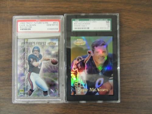 LOT 2 CADE MCNOWN GRADED FOOTBALL CARDS: 1999 TOPPS #54 ROOKIE & 1999 FINEST #FF2 ROOKIE. AS SHOWN. VIEW PICTURE FOR DETAIL.